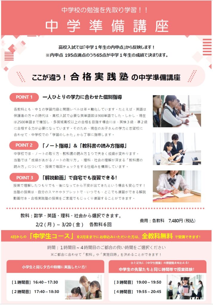 合格実践塾では、「中学準備講座」を開講します。